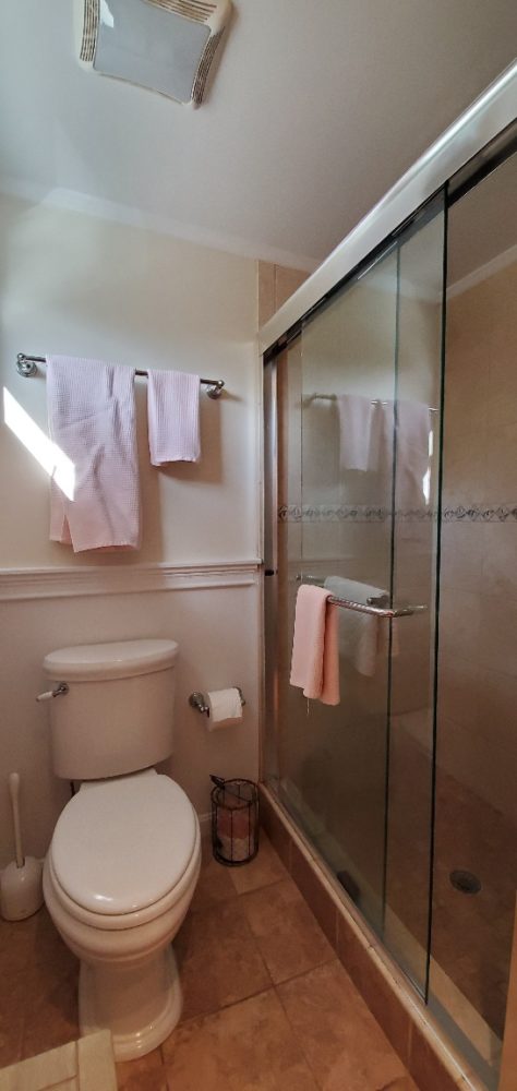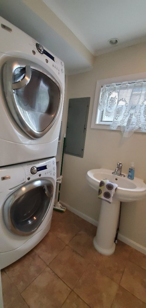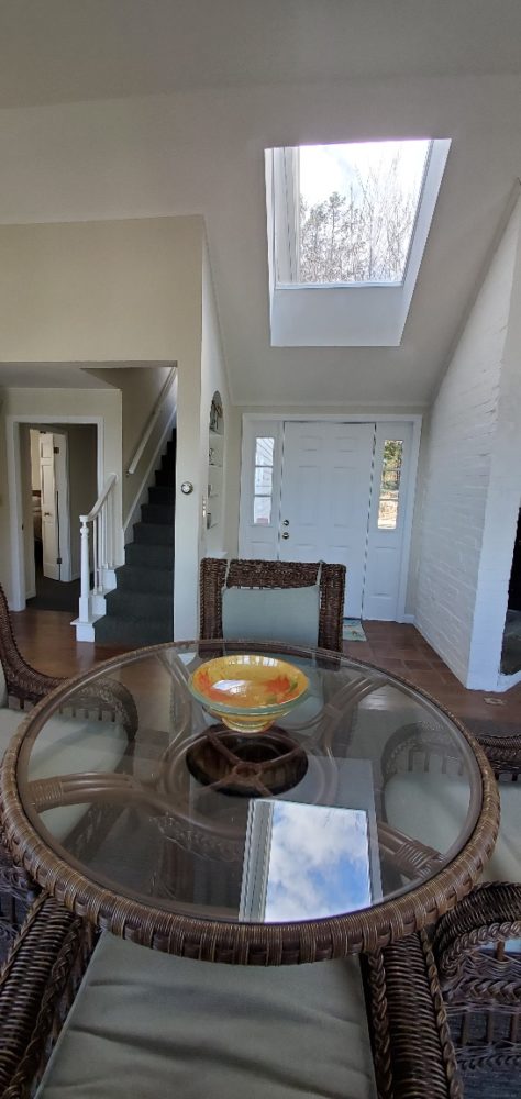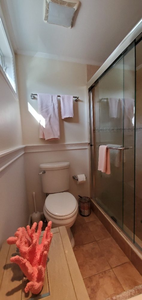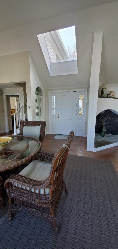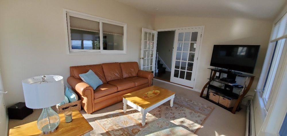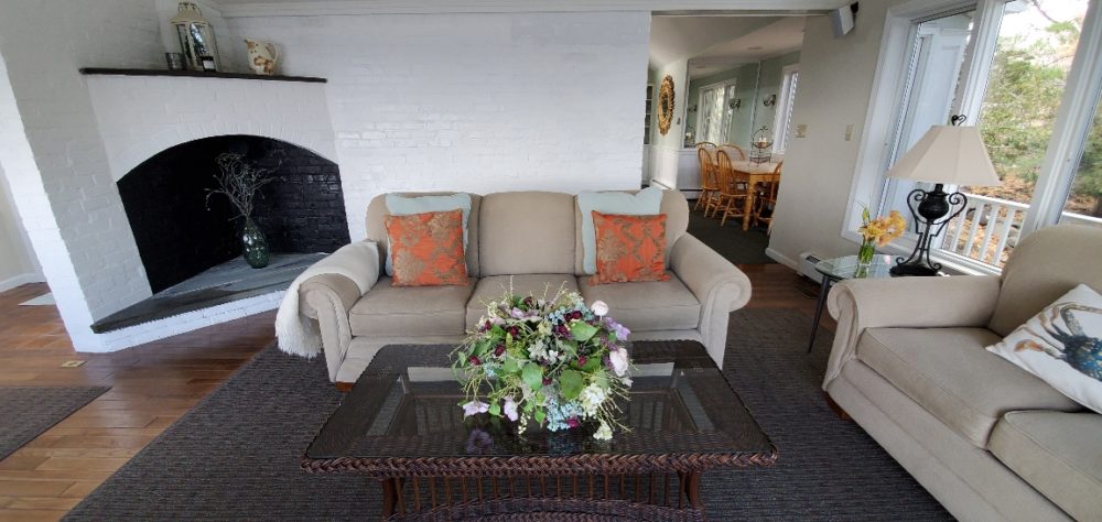 Comfortably furnished amenities include an eat-in kitchen, open concept living room, casual and colorful den and three bedroom, two of which are on the first level.