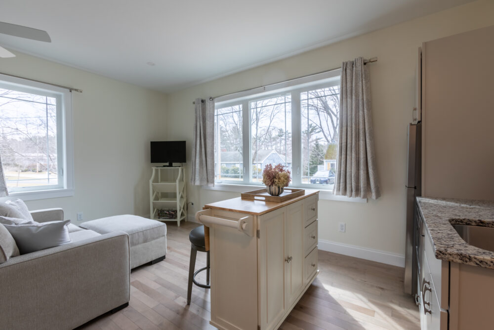 The open‑concept living–dining–kitchen area is the heart of the home—perfect for gathering after a day of exploring. Step out to the outdoor patio to “chat and chew,” share stories, and savor the coastal air.