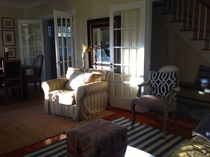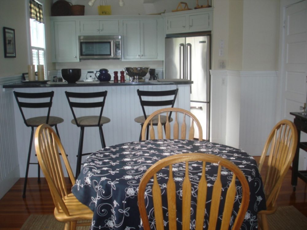 First floor open concept with dining table seating 6. Contemporary kitchen with breakfast bar and breakfast table. Master bedroom and bath on second level with two additional bedrooms and full bathroom.
